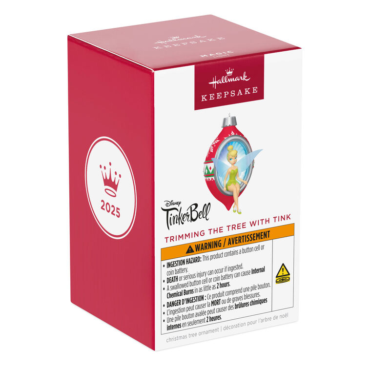 Be filled with festive thoughts when you hang this darling Disney Tinker Bell Christmas tree ornament. The charming fairy, dressed in her iconic green petal dress with translucent pixie wings, perches on a classic red and green ornament that lights up when you press the button. Battery operated.