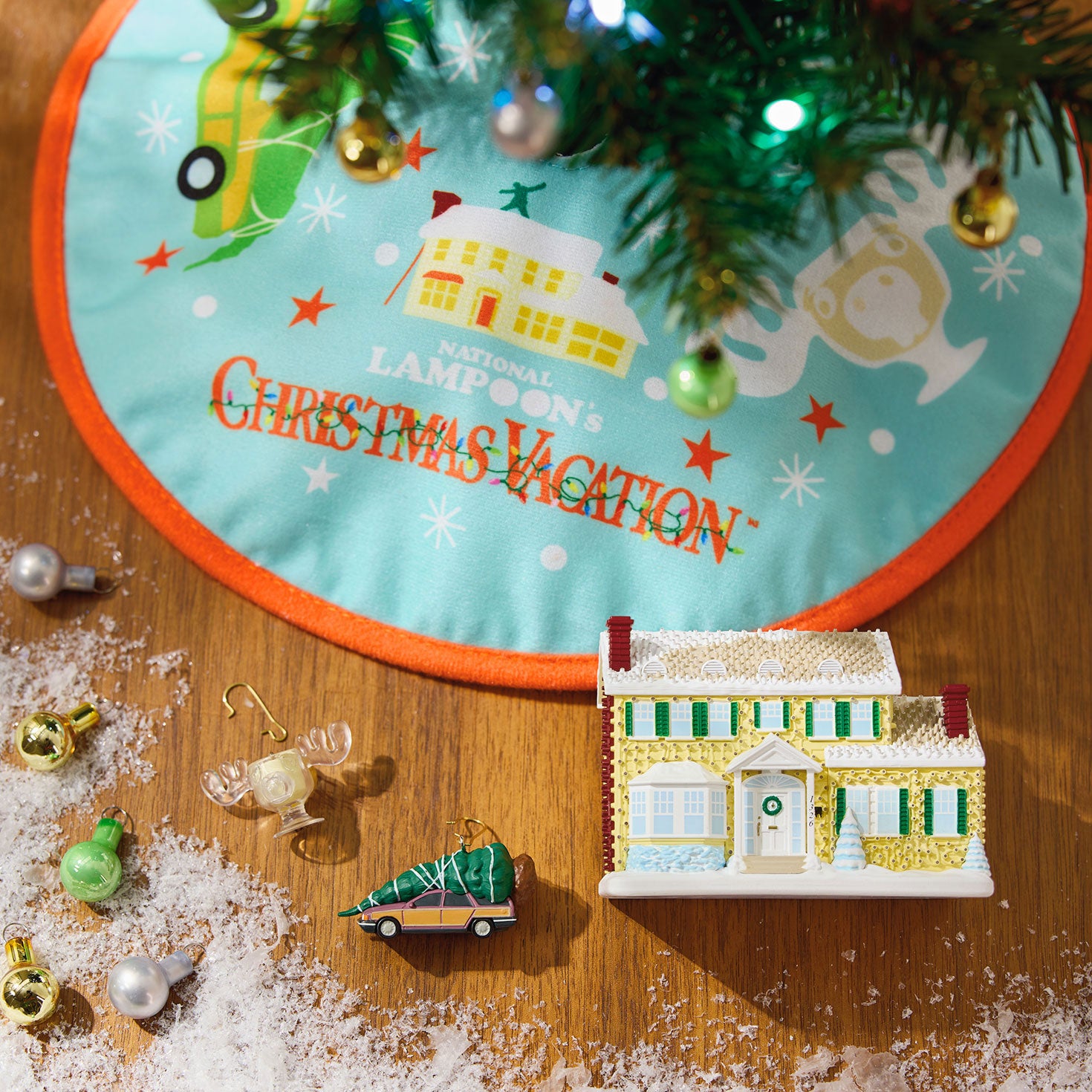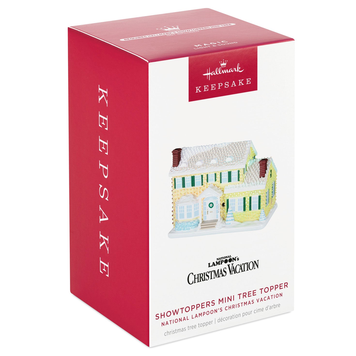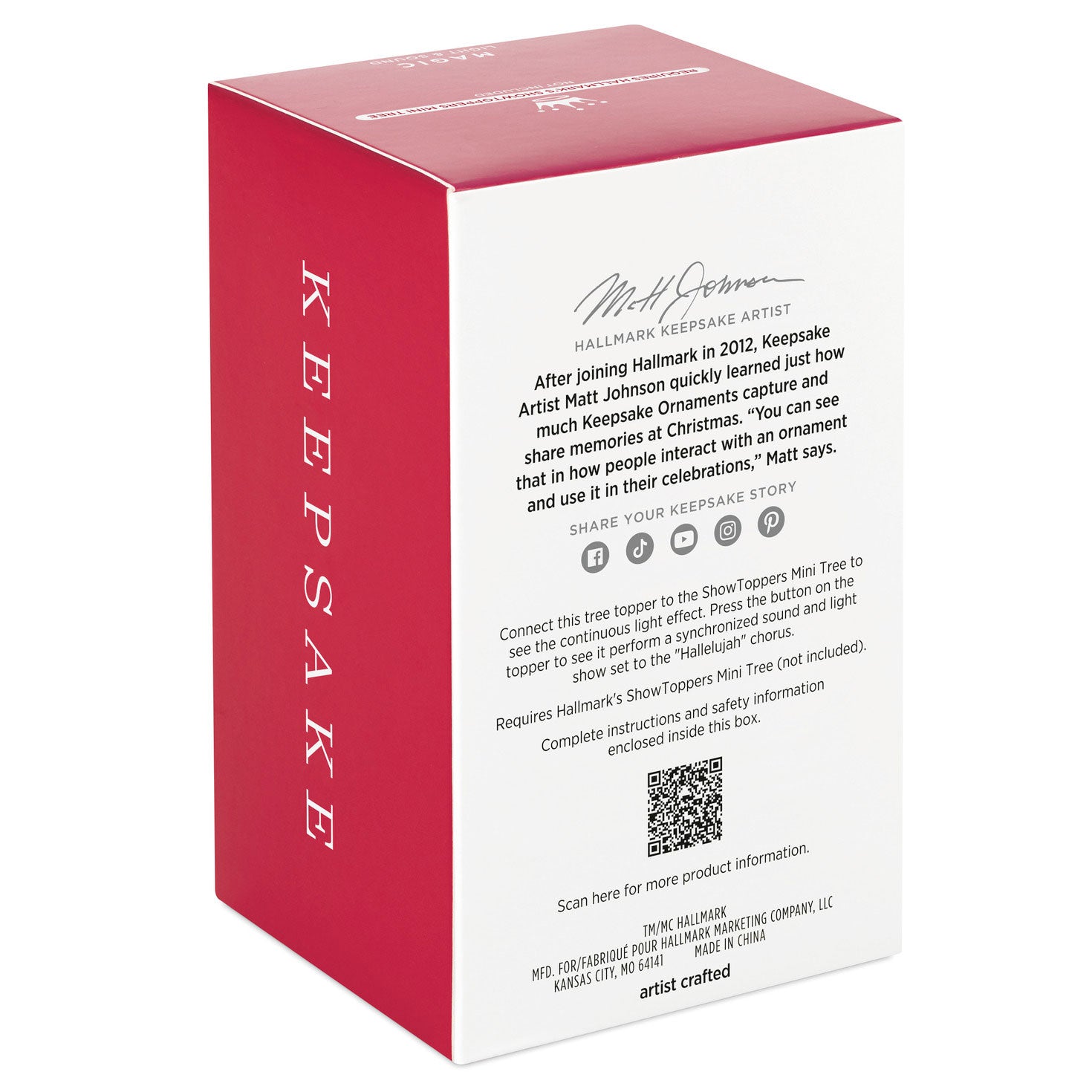 Celebrate the holidays in Griswold style! Connect this National Lampoon’s Christmas Vacation ShowToppers Mini Tree Topper to Hallmark's ShowToppers Mini Tree (sold separately) to see it come to life with a synchronized sound and light performance. Colorful LEDs glow with a continuous default light effect. Press the button to see them put on a festive show set to the "Hallelujah" chorus. Battery operated.